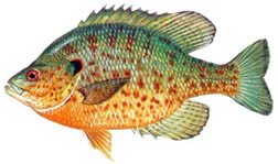 What is the name of this fish?   (Black Crappie, Bowfin, Bluegill, Brook Trout, Brown Trout, Chain Pickerel, Channel Catfish, Flathead Catfish, Gizzard Shad, Grass Carp, Hybrid Striped Bass, Largemouth Bass, Rainbow Trout, Redbreast Sunfish, Redear Sunfish, Smallmouth Bass, Striped Bass, Threadfin Shad, Walleye, Warmouth)